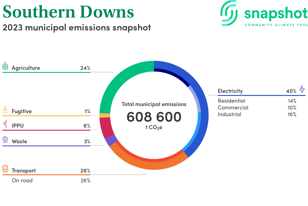 Southern Downs is a regional area that is large in geographical area relative to the state average and has a moderate urban density. Its major emissions source is electricity consumption, due to the community’s scale of population and commercial activity. The second largest source of emissions is agriculture.