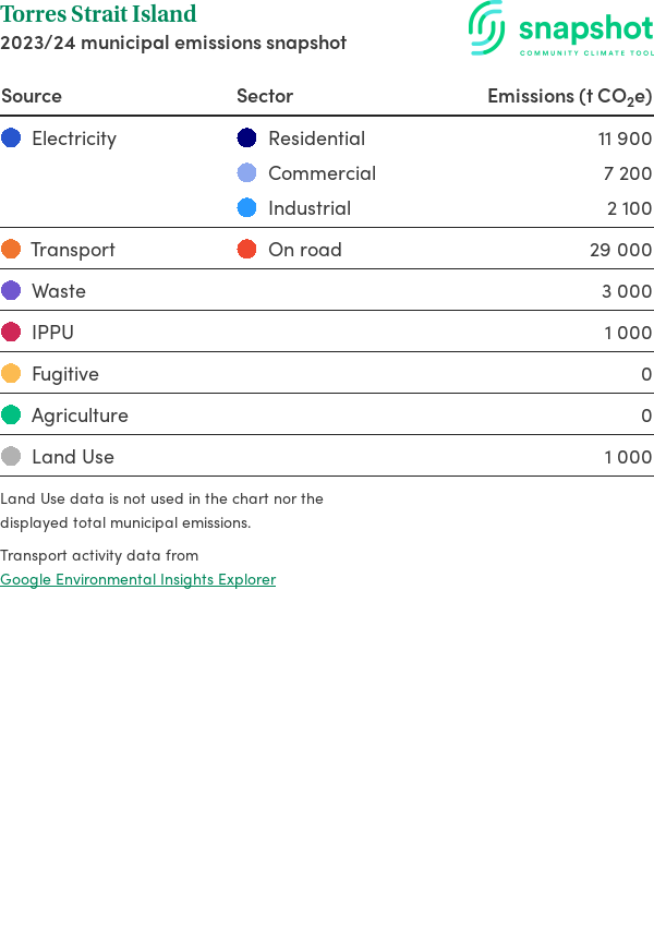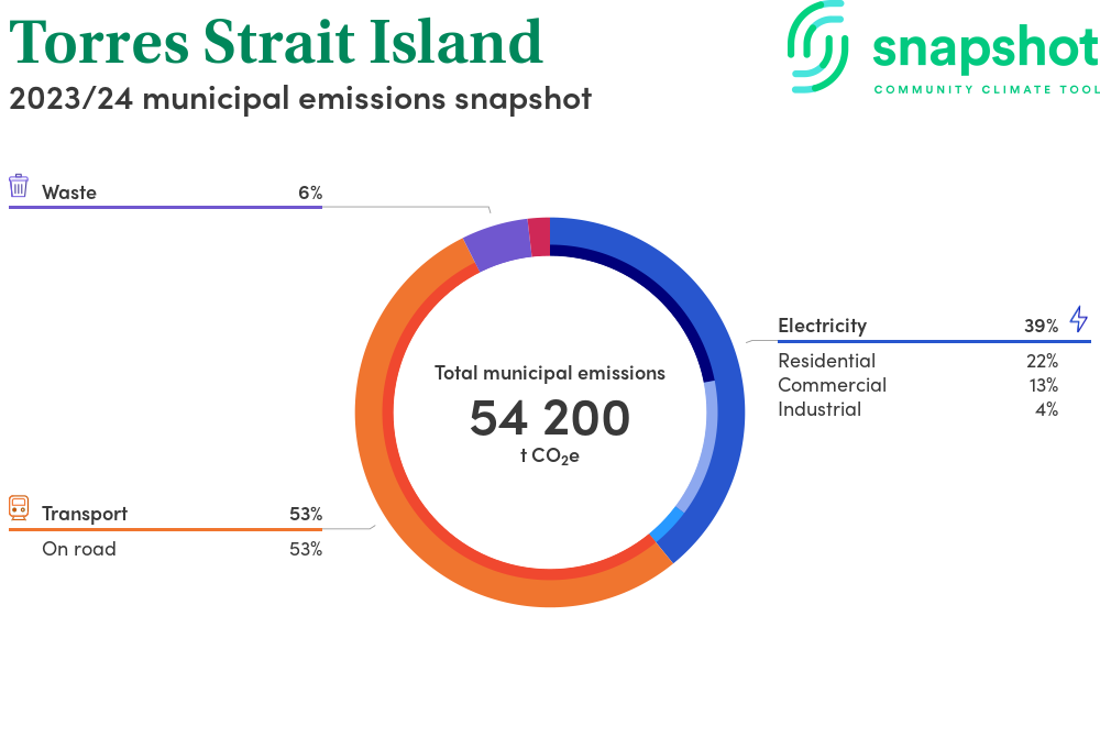 Torres Strait Island is a regional area that is geographically small relative to the state average and has a moderate urban density. Its major emissions source is on road transportation, due to the community’s larger commuting and other travel requirements. The second largest source of emissions is electricity consumption.