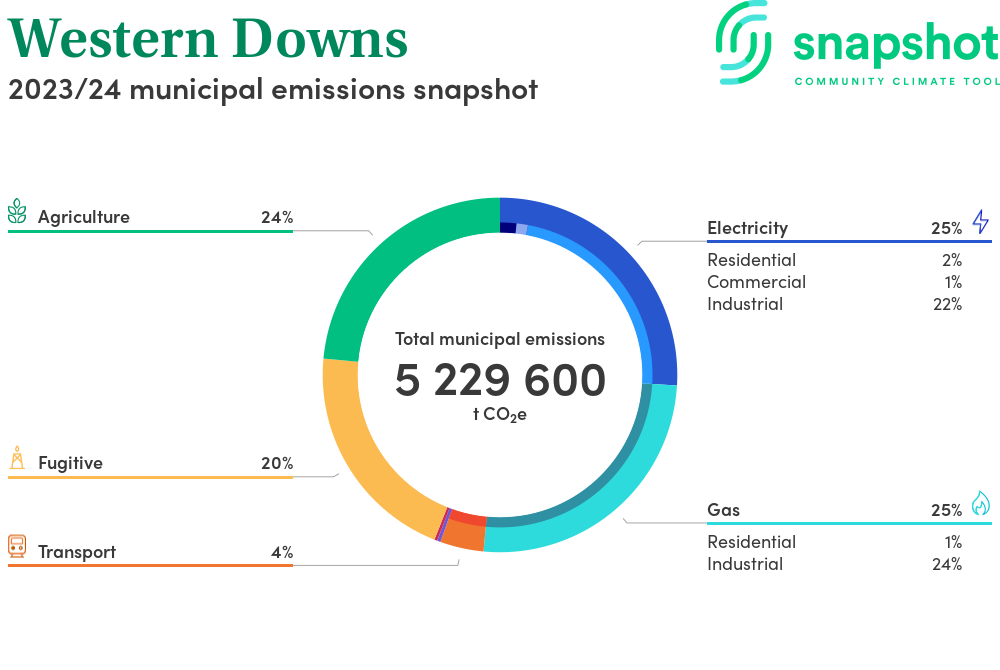 Western Downs is a regional area that is very large in geographical area relative to the state average and has a moderate urban density. Its major emissions source is gas consumption, due to the community’s relatively large population and commercial activity. The second largest source of emissions is industrial gas consumption.