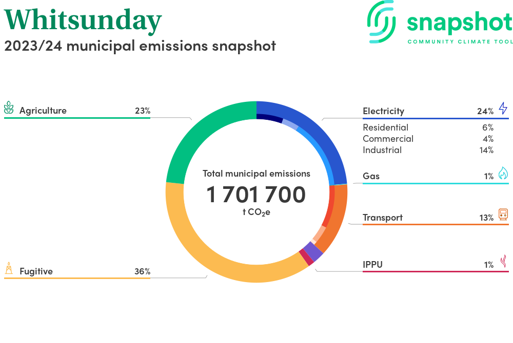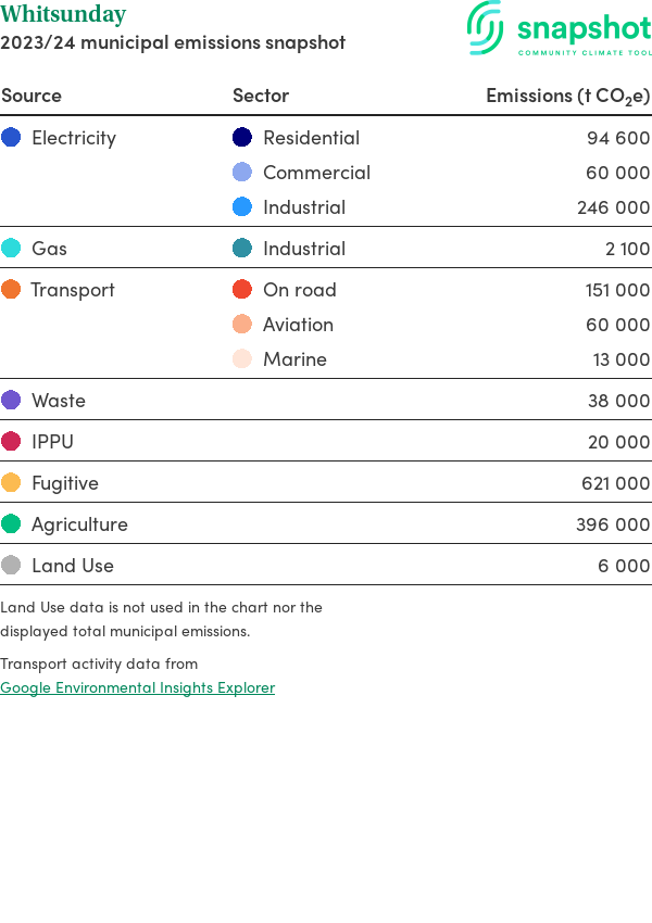Whitsunday is a regional area that is large in geographical area relative to the state average and has a moderate urban density. Its major emissions source is coal mining, due to the community’s coal mining within the municipal boundary. The second largest source of emissions is agriculture.