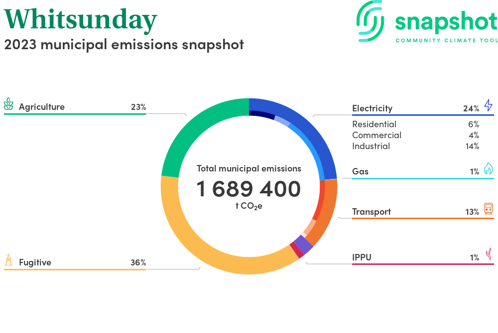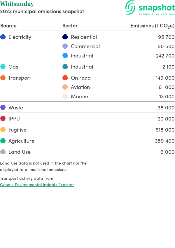 Whitsunday is a regional area that is large in geographical area relative to the state average and has a moderate urban density. Its major emissions source is coal mining, due to the community’s coal mining within the municipal boundary. The second largest source of emissions is agriculture.