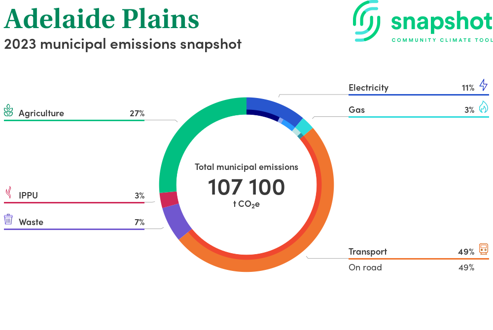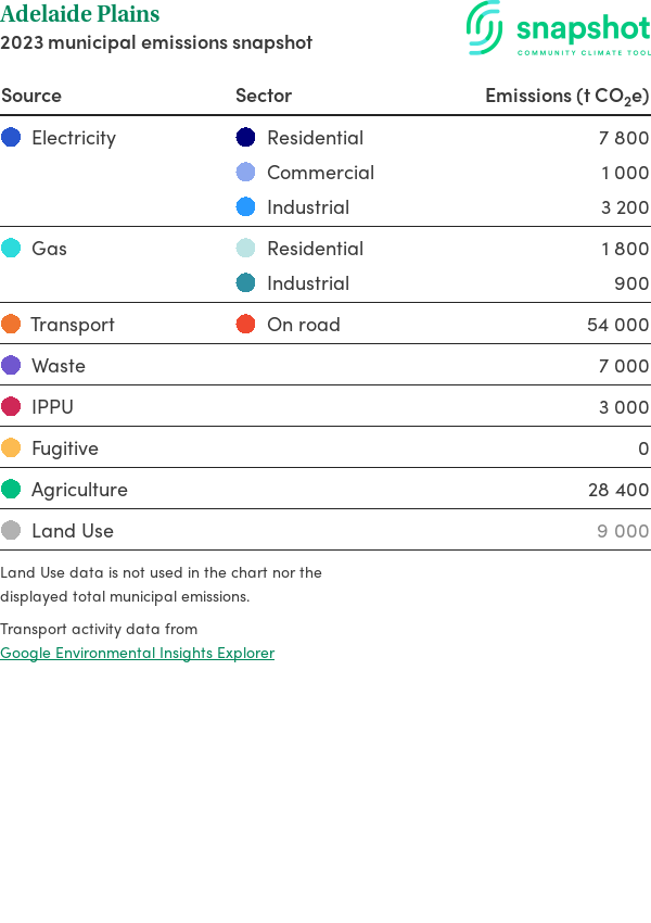 Adelaide Plains is a district council area that is geographically small relative to the state average and has a moderate urban density. Its major emissions source is on road transportation, due to the community’s larger commuting and other travel requirements. The second largest source of emissions is agriculture.