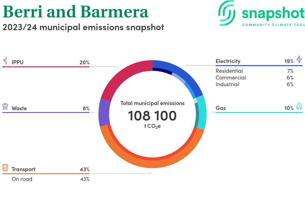 Berri and Barmera is a district council area that is geographically small relative to the state average and has a moderate urban density. Its major emissions source is on road transportation, due to the community’s larger commuting and other travel requirements. The second largest source of emissions is electricity consumption.