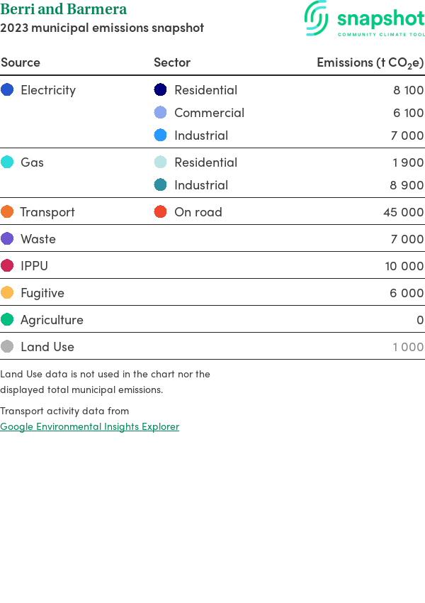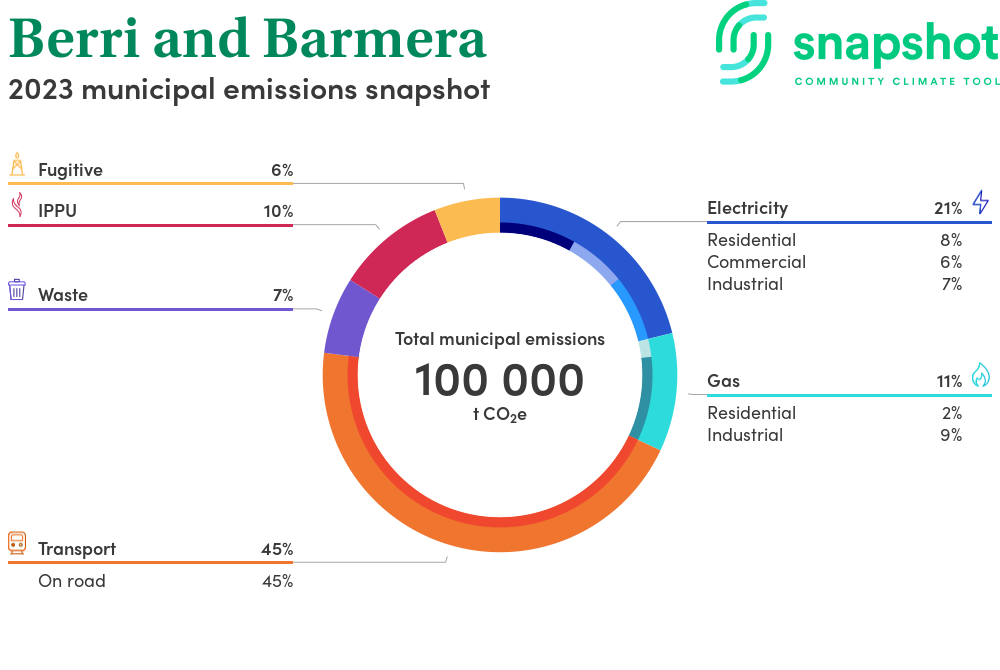 Berri and Barmera is a district council area that is geographically small relative to the state average and has a moderate urban density. Its major emissions source is on road transportation, due to the community’s larger commuting and other travel requirements. The second largest source of emissions is electricity consumption.