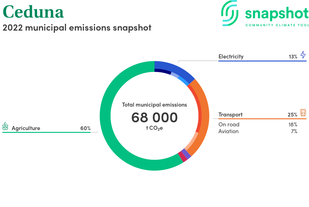 Ceduna is a district council area that is moderate in size relative to the state average and has a low urban density. Its major emissions source is agriculture, due to the community’s relatively large amount of agricultural activity and low population. The second largest source of emissions is on road transportation.