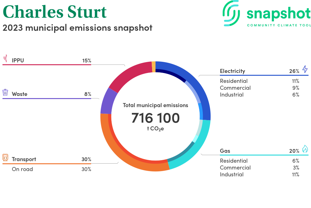 Charles Sturt is a city that is geographically very small relative to the state average and has a very high urban density. Its major emissions source is electricity consumption, due to the community’s scale of population and commercial activity. The second largest source of emissions is gas consumption.