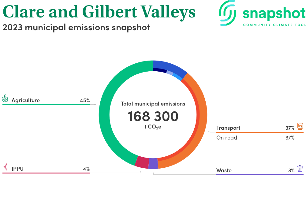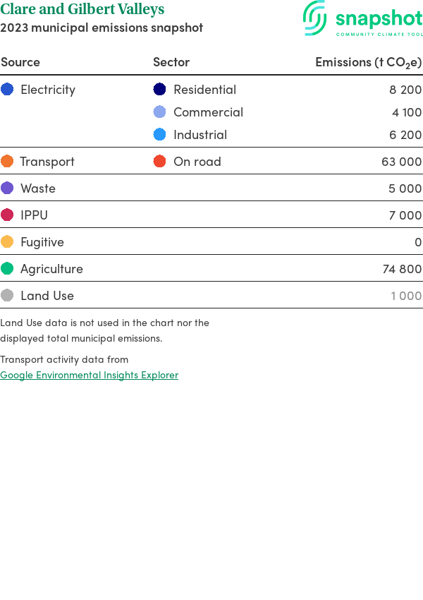 Clare and Gilbert Valleys is a district council area that is geographically small relative to the state average and has a low urban density. Its major emissions source is agriculture, due to the community’s relatively large amount of agricultural activity and low population. The second largest source of emissions is on road transportation.