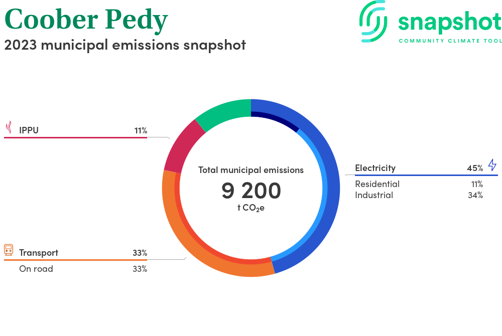 Coober Pedy is a district council area that is geographically very small relative to the state average and has a moderate urban density. Its major emissions source is electricity consumption with the majority of this coming from industrial electricity consumption.