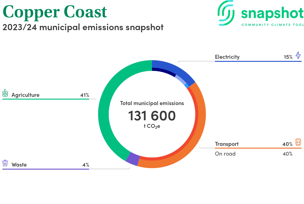 Elliston is a district council area that is moderate in size relative to the state average and has a very low urban density. Its major emissions source is agriculture, due to the community’s relatively large amount of agricultural activity and low population. The second largest source of emissions is on road transportation.