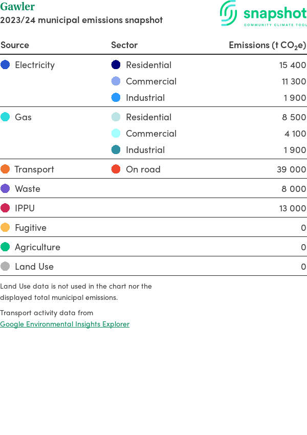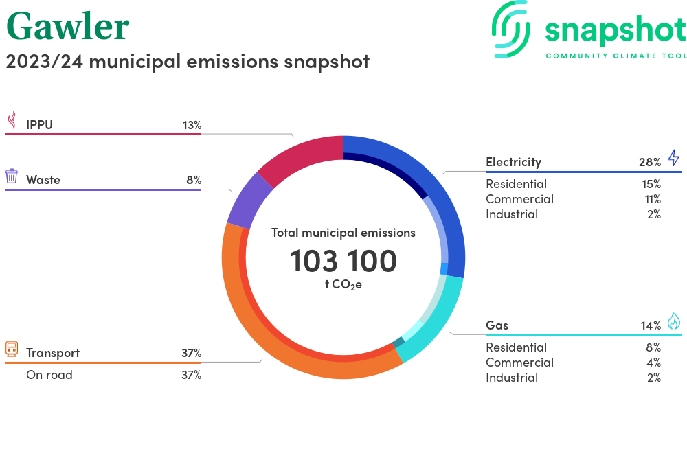 Gawler is a town that is geographically very small relative to the state average and has a high urban density. Its major emissions source is on road transportation, due to the community’s larger commuting and other travel requirements. The second largest source of emissions is electricity consumption.