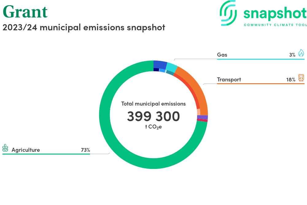 Grant is a district council area that is geographically small relative to the state average and has a low urban density. Its major emissions source is agriculture, due to the community’s relatively large amount of agricultural activity and low population. The second largest source of emissions is on road transportation.