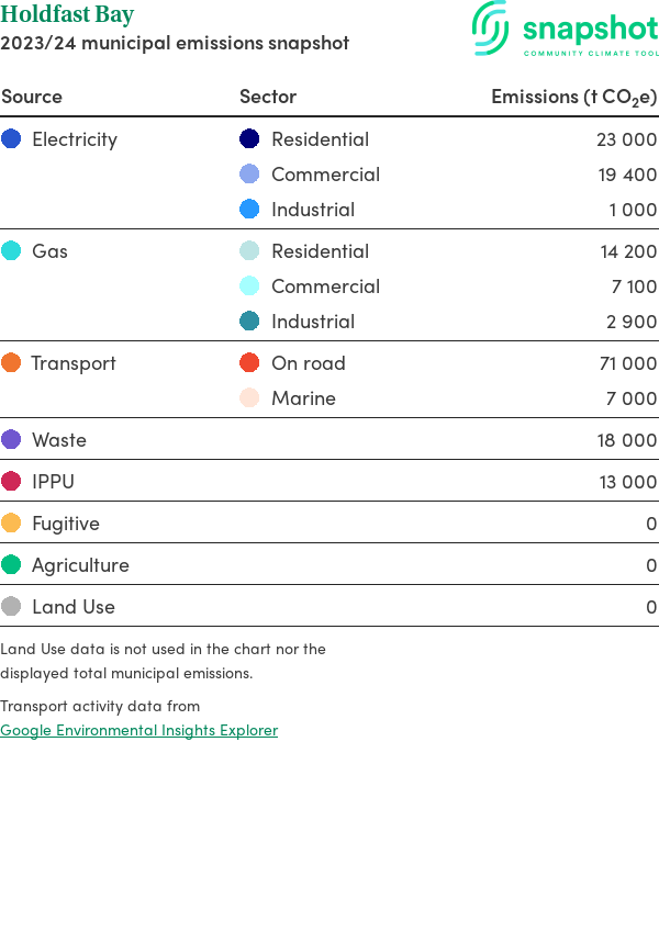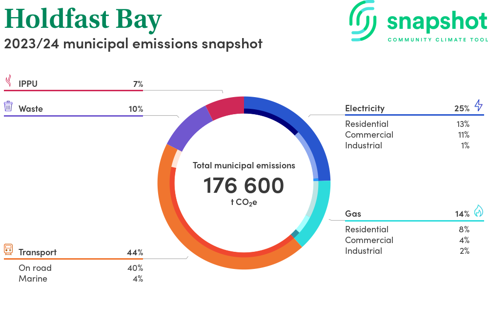 Holdfast Bay is a city that is geographically very small relative to the state average and has a very high urban density. Its major emissions source is on road transportation, due to the community’s larger commuting and other travel requirements. The second largest source of emissions is electricity consumption.