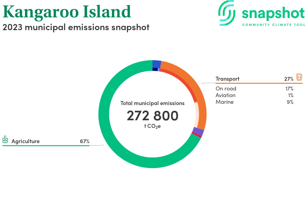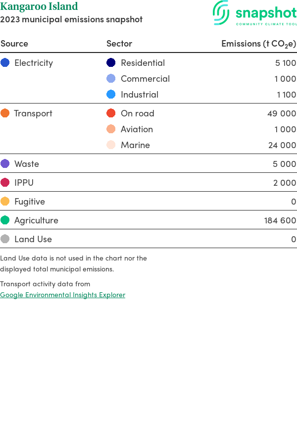 Kangaroo Island is a district council area that is moderate in size relative to the state average and has a low urban density. Its major emissions source is agriculture, due to the community’s relatively large amount of agricultural activity and low population. The second largest source of emissions is on road transportation.