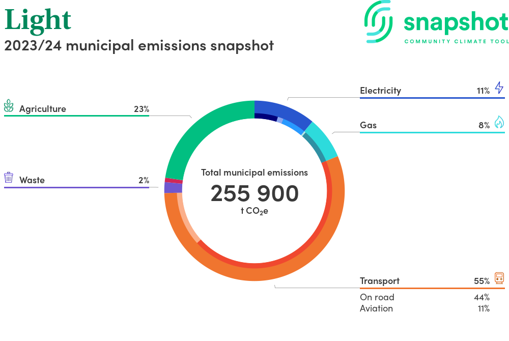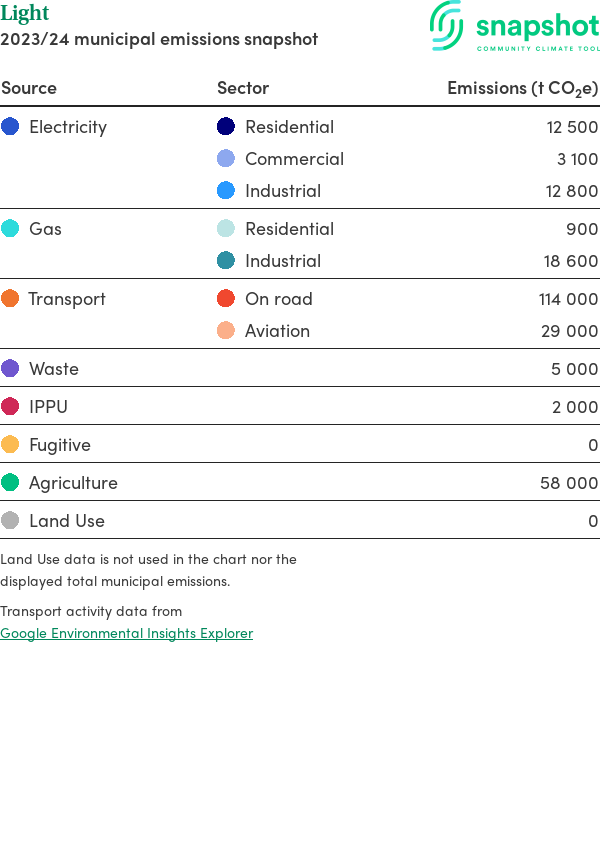 Light is a regional area that is geographically small relative to the state average and has a moderate urban density. Its major emissions source is on road transportation, due to the community’s larger commuting and other travel requirements. The second largest source of emissions is agriculture.