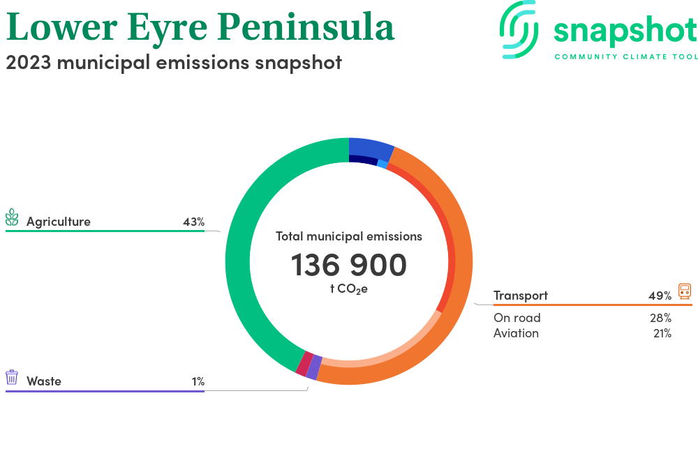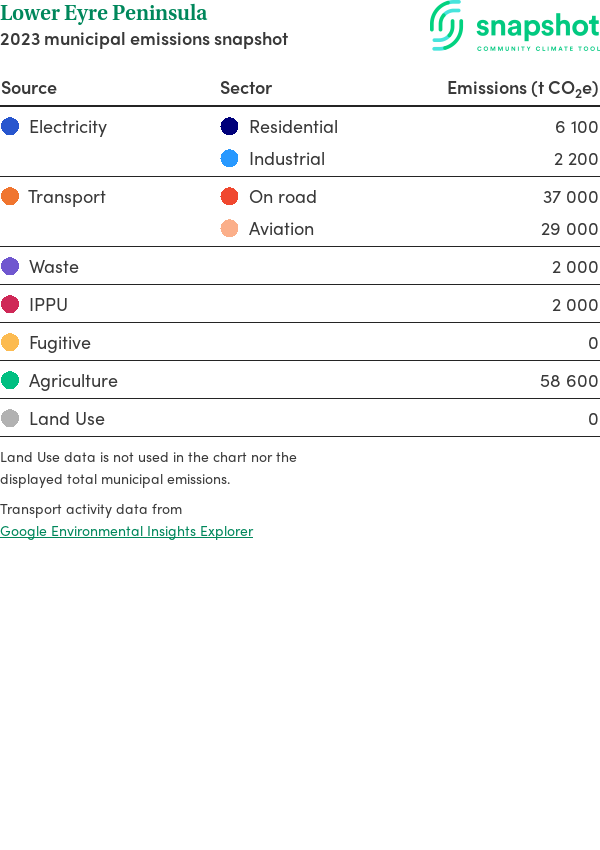 Lower Eyre Peninsula is a district council area that is moderate in size relative to the state average and has a low urban density. Its major emissions source is agriculture, due to the community’s relatively large amount of agricultural activity and low population. The second largest source of emissions is aviation.