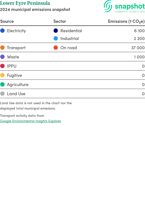 This report outlines the major sources of carbon emissions for the entire region (municipality, electorate, or state). Due to the approximate nature of the profile, the emission values are represented as rounded numbers. This report includes the following sources: