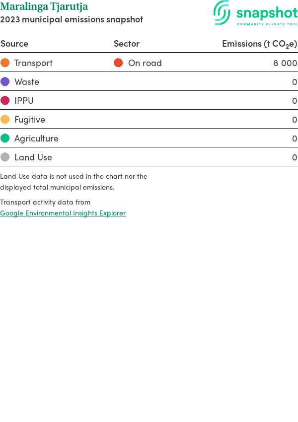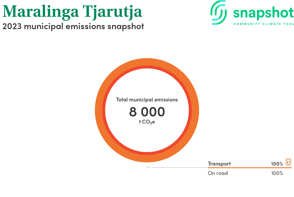 Maralinga Tjarutja is an Aboriginal council area that is very large in geographical area relative to the state average and has a very low urban density. Its major emissions source is on road transportation, due to the community’s larger commuting and other travel requirements. The second largest source of emissions is residential electricity consumption.