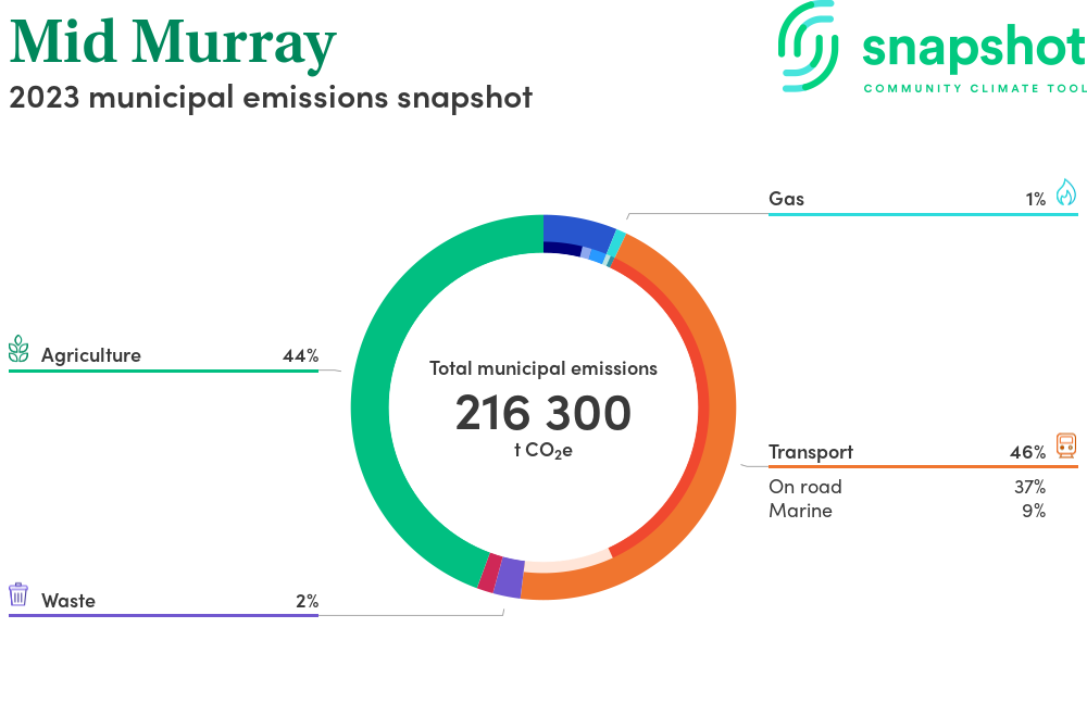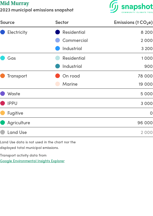 Mid Murray is a district council area that is moderate in size relative to the state average and has a low urban density. Its major emissions source is agriculture, due to the community’s relatively large amount of agricultural activity and low population. The second largest source of emissions is on road transportation.
