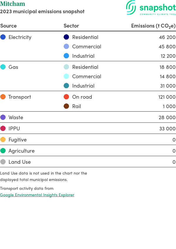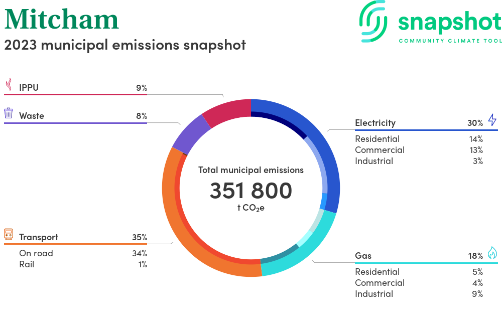 Mitcham is a city that is geographically very small relative to the state average and has a high urban density. Its major emissions source is electricity consumption, due to the community’s scale of population and commercial activity. The second largest source of emissions is on road transportation.
