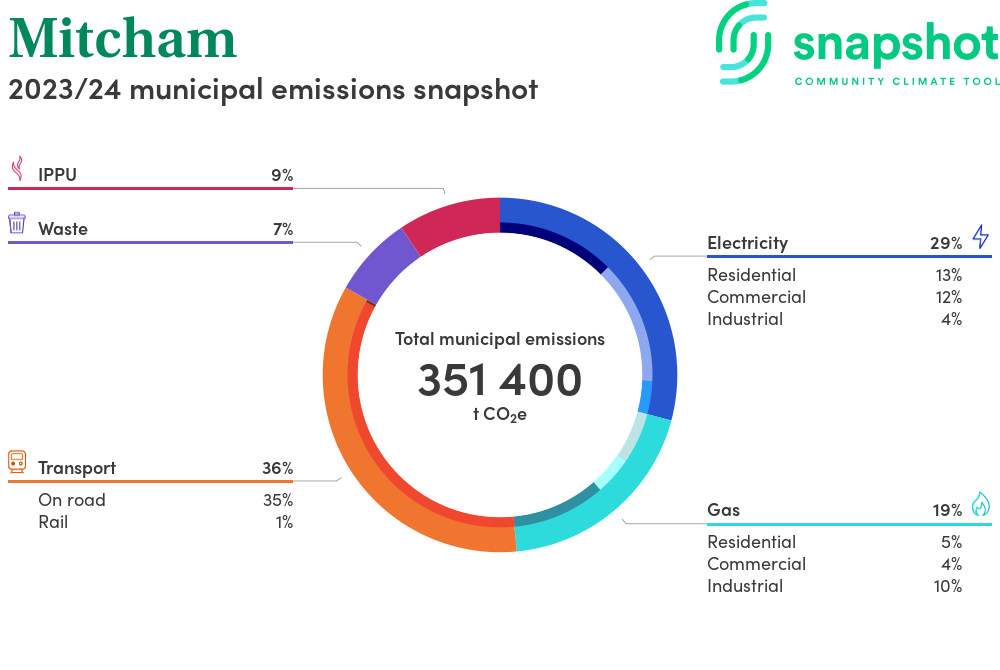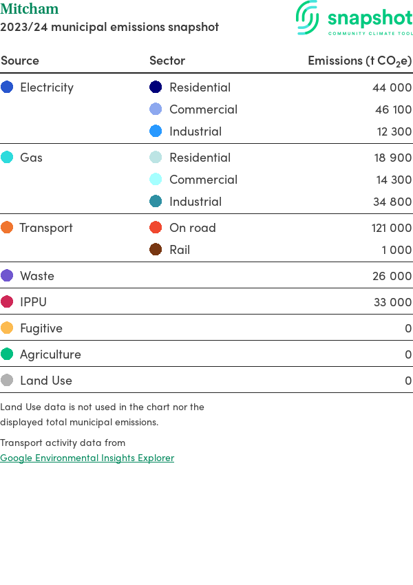 Mitcham is a city that is geographically very small relative to the state average and has a high urban density. Its major emissions source is electricity consumption, due to the community’s scale of population and commercial activity. The second largest source of emissions is on road transportation.