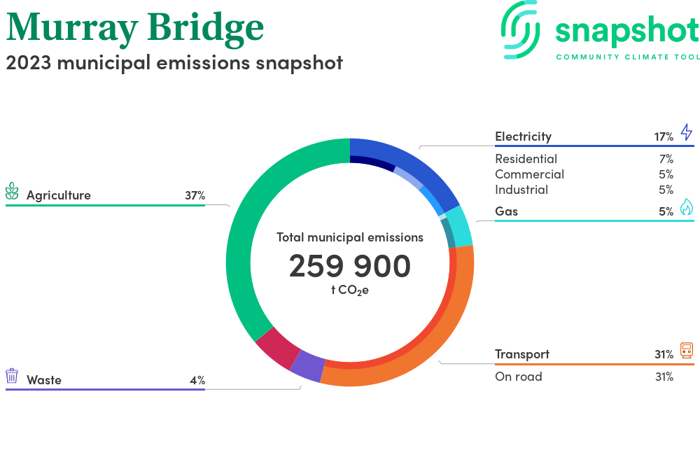 Murray Bridge is a rural city that is geographically small relative to the state average and has a moderate urban density. Its major emissions source is agriculture, due to the community’s relatively large amount of agricultural activity and low population. The second largest source of emissions is on road transportation.