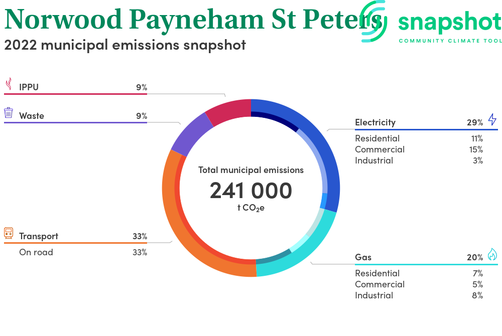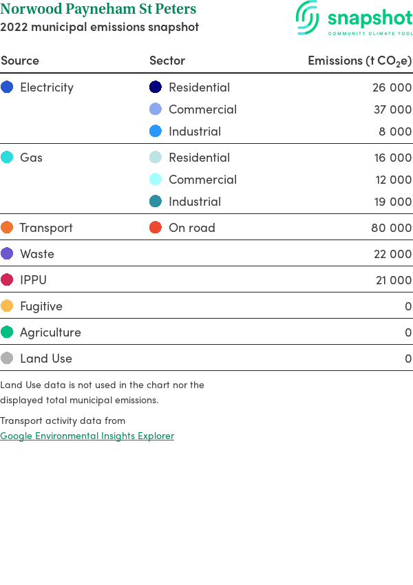 Norwood Payneham St Peters is a city that is geographically very small relative to the state average and has a very high urban density. Its major emissions source is electricity consumption, due to the community’s scale of population and commercial activity. The second largest source of emissions is on road transportation.
