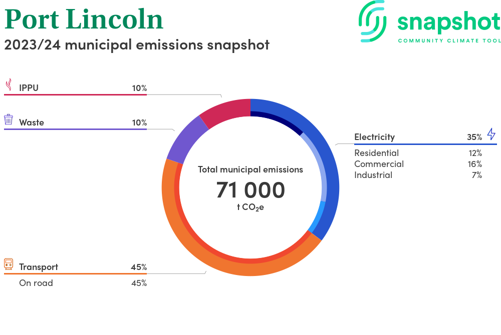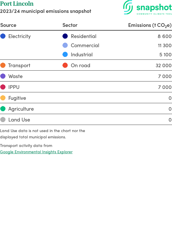 Port Lincoln is a city that is geographically very small relative to the state average and has a high urban density. Its major emissions source is on road transportation, due to the community’s larger commuting and other travel requirements. The second largest source of emissions is electricity consumption.