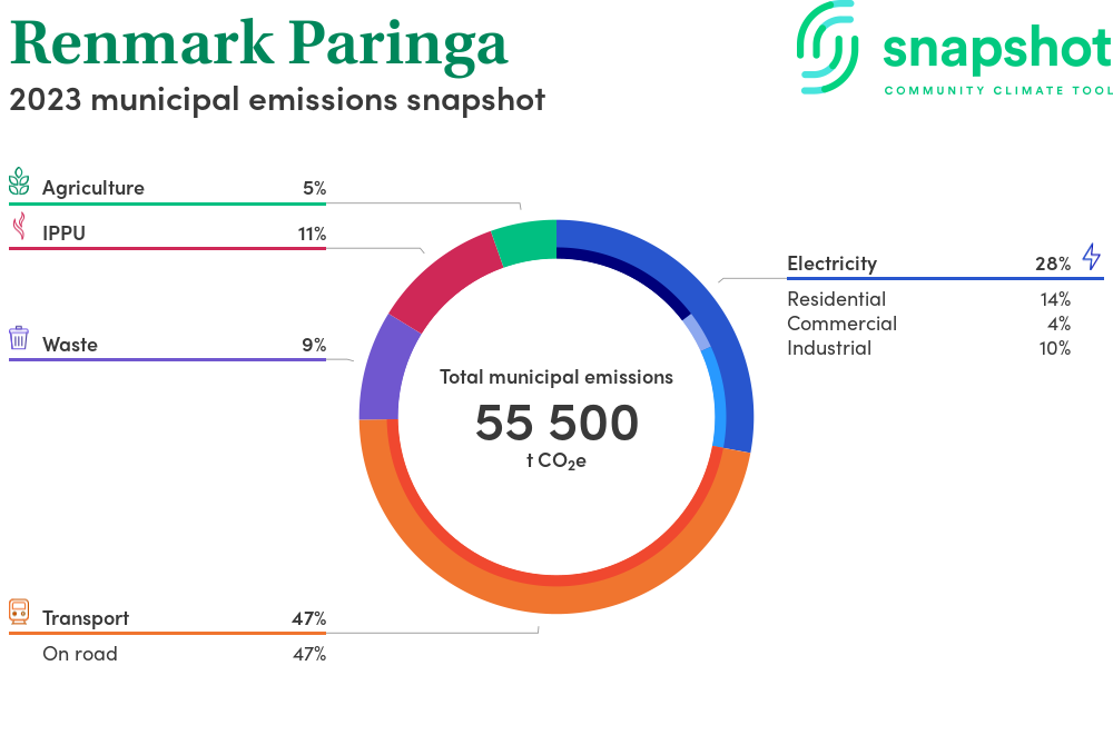Renmark Paringa is a district council area that is geographically small relative to the state average and has a moderate urban density. Its major emissions source is on road transportation, due to the community’s larger commuting and other travel requirements. The second largest source of emissions is electricity consumption.