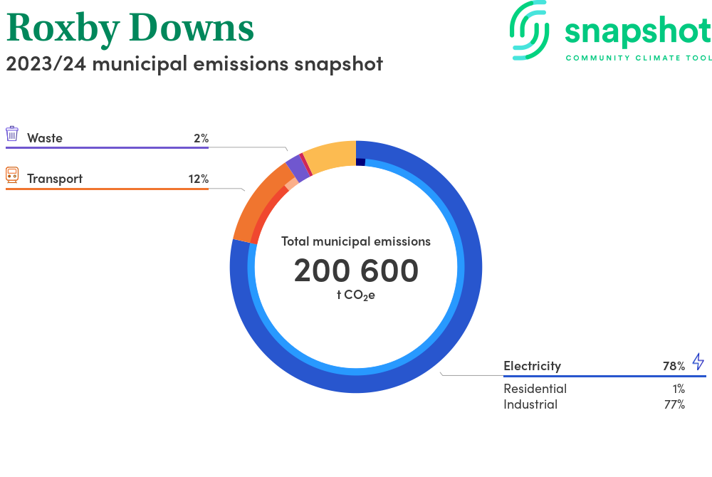 Roxby Downs is a municipality that is geographically small relative to the state average and has a moderate urban density. Its major emissions source is electricity consumption with the majority of this coming from industrial electricity consumption.