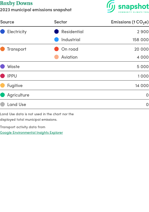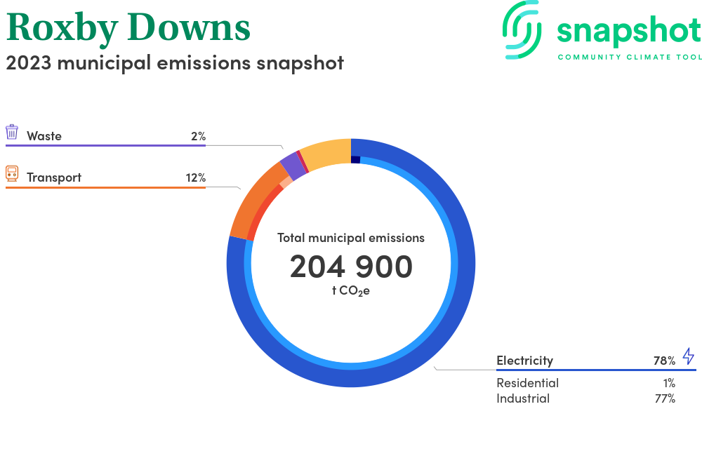 Roxby Downs is a municipality that is geographically small relative to the state average and has a moderate urban density. Its major emissions source is electricity consumption with the majority of this coming from industrial electricity consumption.