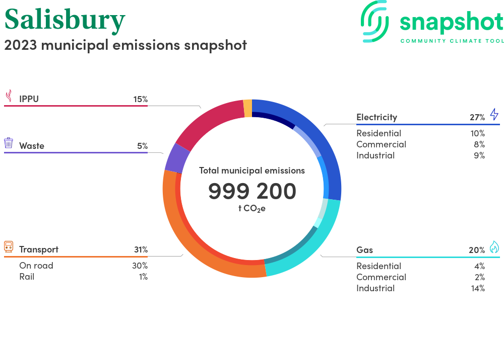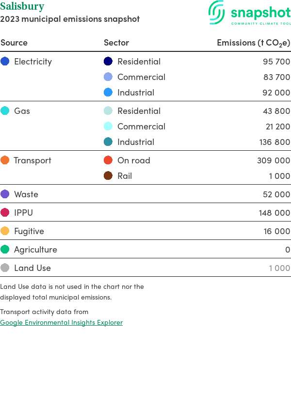 Salisbury is a city that is geographically small relative to the state average and has a high urban density. Its major emissions source is electricity consumption, due to the community’s scale of population and commercial activity. The second largest source of emissions is gas consumption.