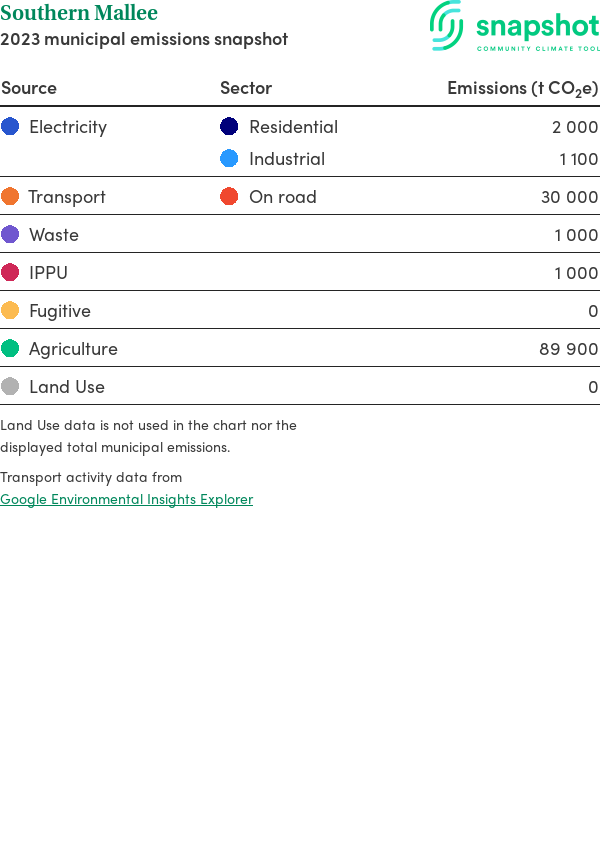 Southern Mallee is a district council area that is moderate in size relative to the state average and has a very low urban density. Its major emissions source is agriculture, due to the community’s relatively large amount of agricultural activity and low population. The second largest source of emissions is on road transportation.