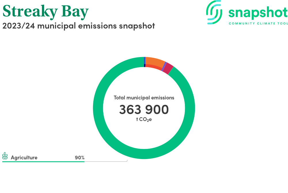 Streaky Bay is a district council area that is moderate in size relative to the state average and has a low urban density. Its major emissions source is agriculture, due to the community’s relatively large amount of agricultural activity and low population. The second largest source of emissions is on road transportation.