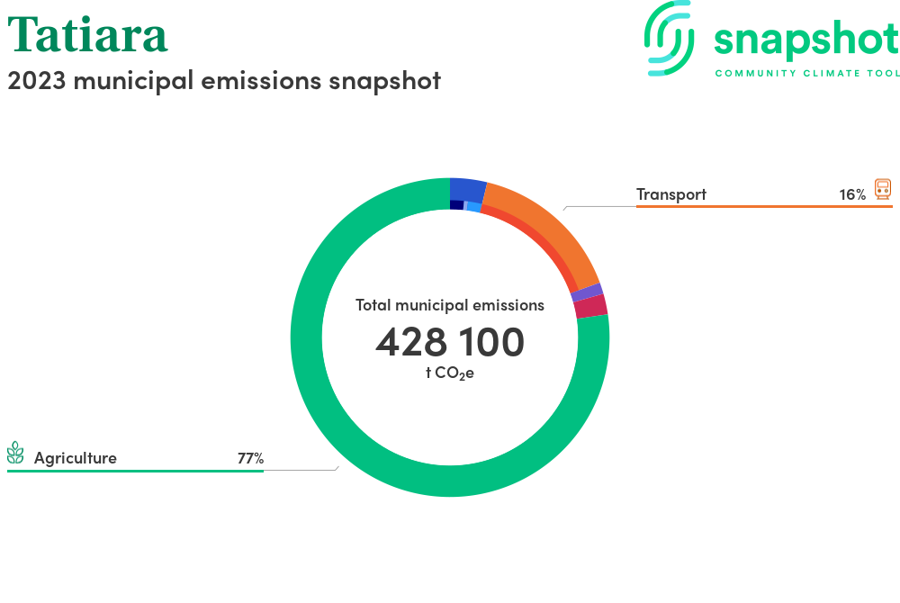 Tatiara is a district council area that is moderate in size relative to the state average and has a low urban density. Its major emissions source is agriculture, due to the community’s relatively large amount of agricultural activity and low population. The second largest source of emissions is on road transportation.