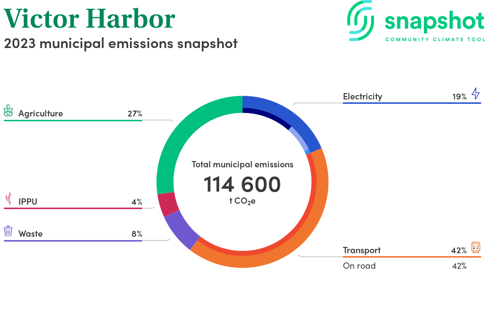 Victor Harbor is a city that is geographically small relative to the state average and has a moderate urban density. Its major emissions source is on road transportation, due to the community’s larger commuting and other travel requirements. The second largest source of emissions is agriculture.