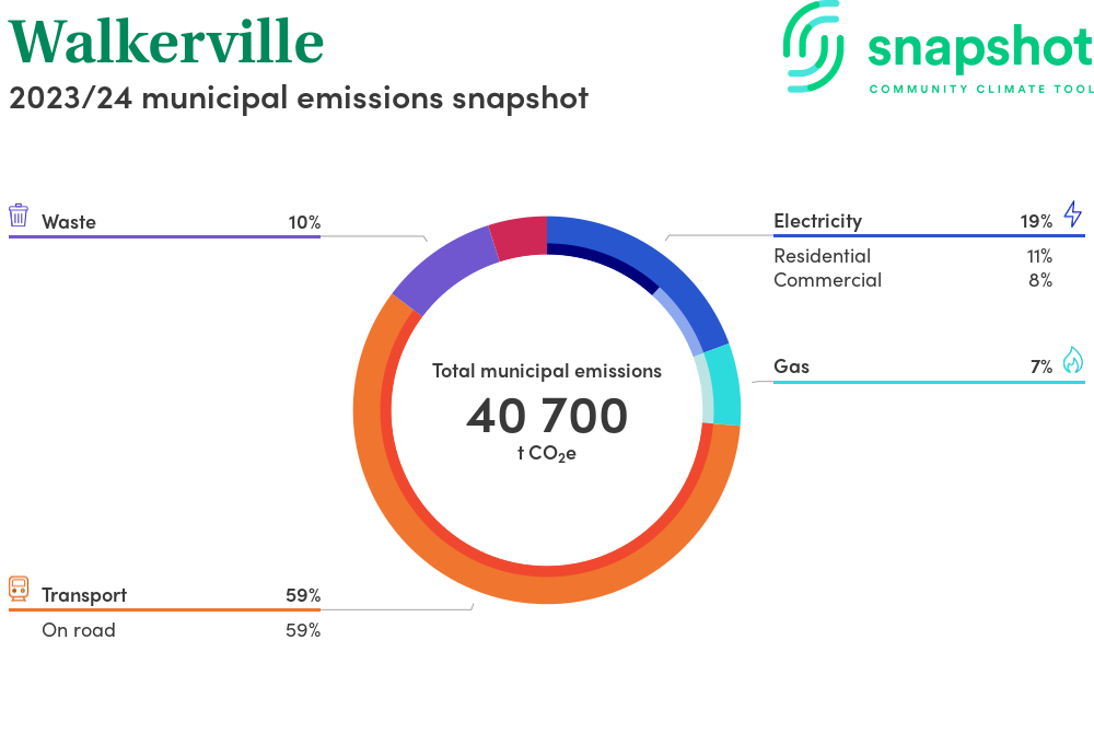 Walkerville is a municipality that is geographically very small relative to the state average and has a very high urban density. Its major emissions source is on road transportation, due to the community’s larger commuting and other travel requirements. The second largest source of emissions is electricity consumption.