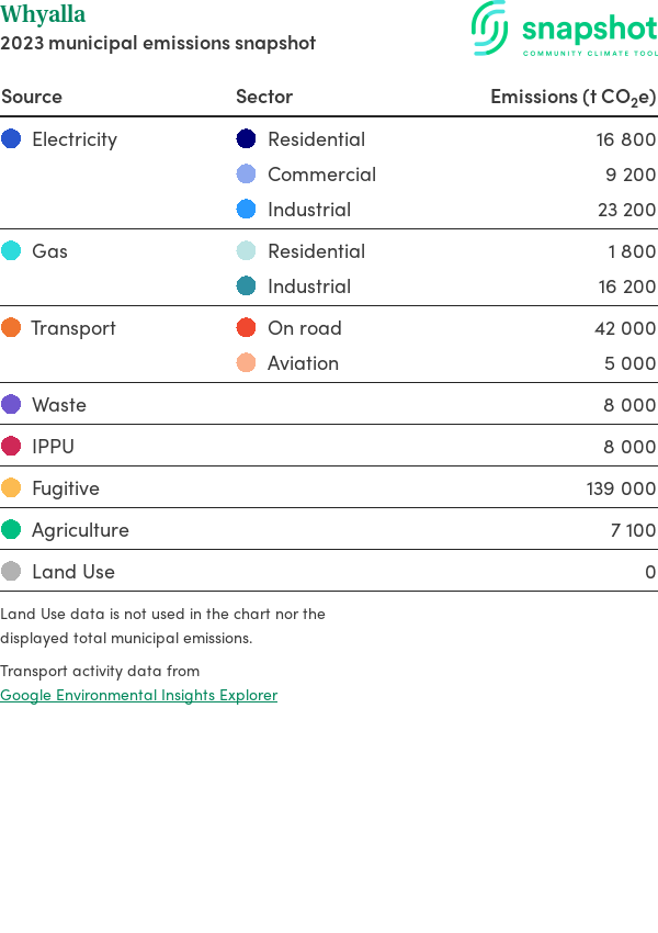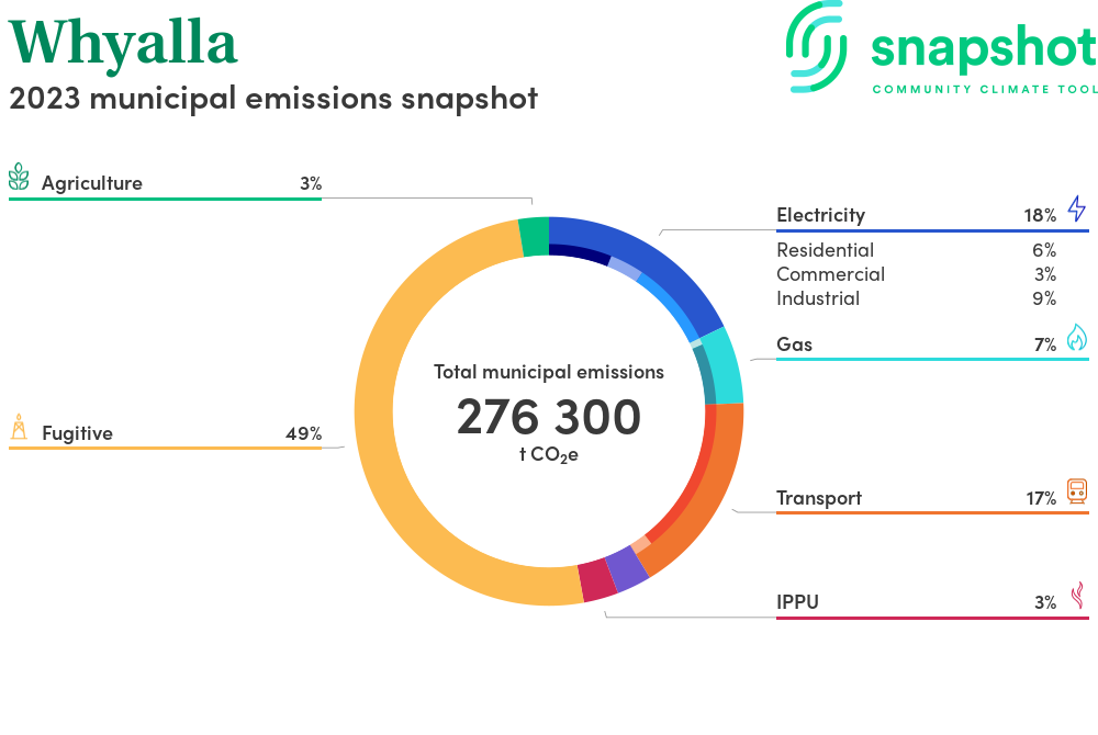 Whyalla is a city that is geographically small relative to the state average and has a moderate urban density. Its major emissions source is oil and natural gas, due to the community’s oil and natural gas within the municipal boundary. The second largest source of emissions is electricity consumption.
