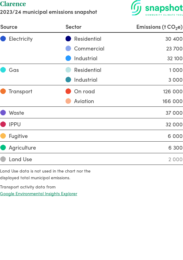 This report outlines the major sources of carbon emissions for the entire region (municipality, electorate, or state). Due to the approximate nature of the profile, the emission values are represented as rounded numbers. This report includes the following sources: