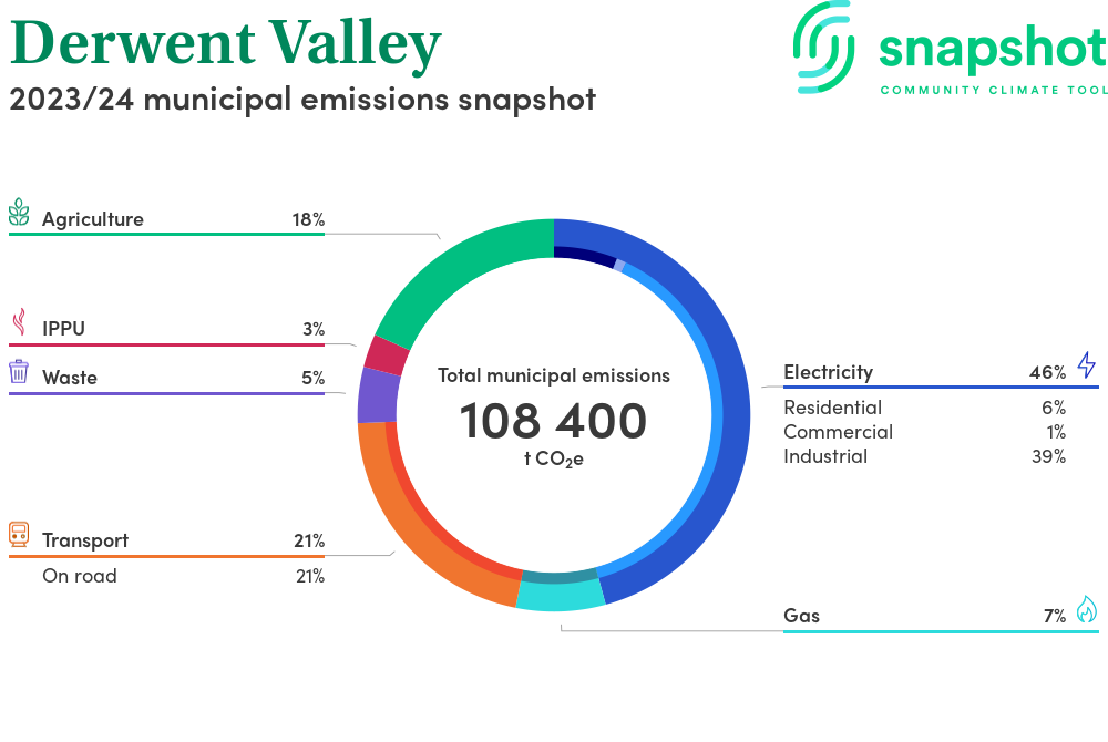 Derwent Valley is a municipality that is moderate in size relative to the state average and has a low urban density. Its major emissions source is electricity consumption with the majority of this coming from industrial electricity consumption.