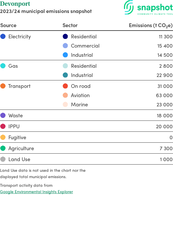 Devonport is a city that is geographically small relative to the state average and has a very high urban density. Its major emissions source is electricity consumption, due to the community’s scale of population and commercial activity. The second largest source of emissions is gas consumption.