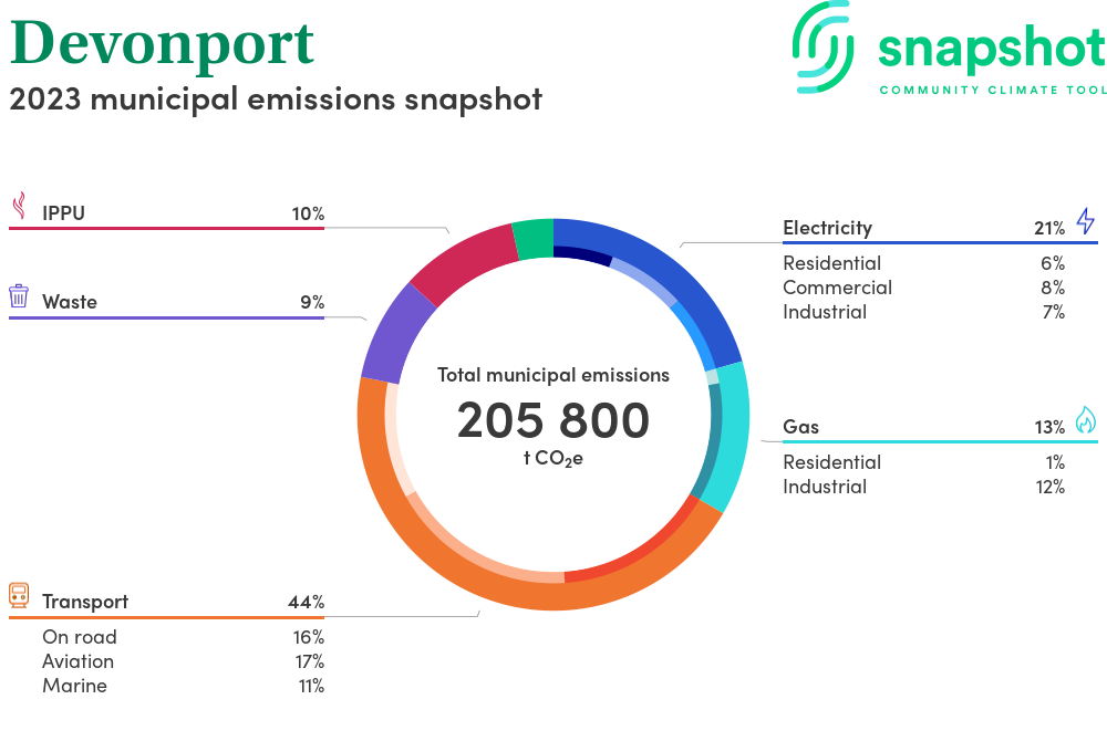 Devonport is a city that is geographically small relative to the state average and has a very high urban density. Its major emissions source is electricity consumption, due to the community’s scale of population and commercial activity. The second largest source of emissions is gas consumption.