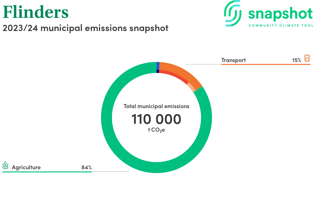 Flinders is a municipality that is geographically small relative to the state average and has a very low urban density. Its major emissions source is agriculture, due to the community’s relatively large amount of agricultural activity and low population. The second largest source of emissions is land use change.