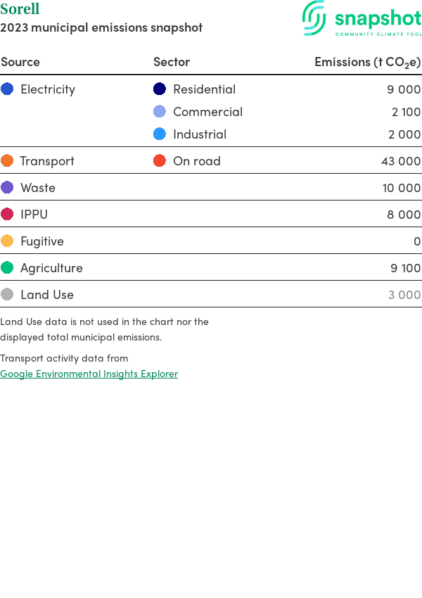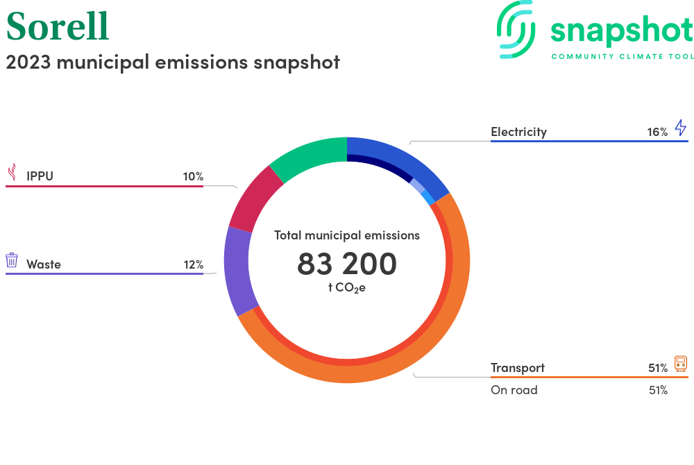 Sorell is a municipality that is geographically small relative to the state average and has a moderate urban density. Its major emissions source is on road transportation, due to the community’s larger commuting and other travel requirements. The second largest source of emissions is electricity consumption.