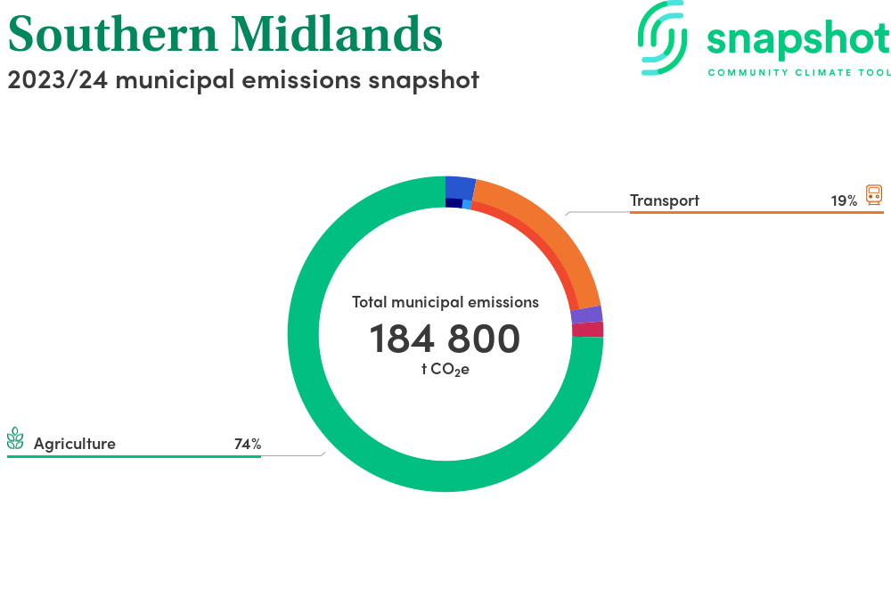 Southern Midlands is a municipality that is moderate in size relative to the state average and has a low urban density. Its major emissions source is agriculture, due to the community’s relatively large amount of agricultural activity and low population. The second largest source of emissions is on road transportation.