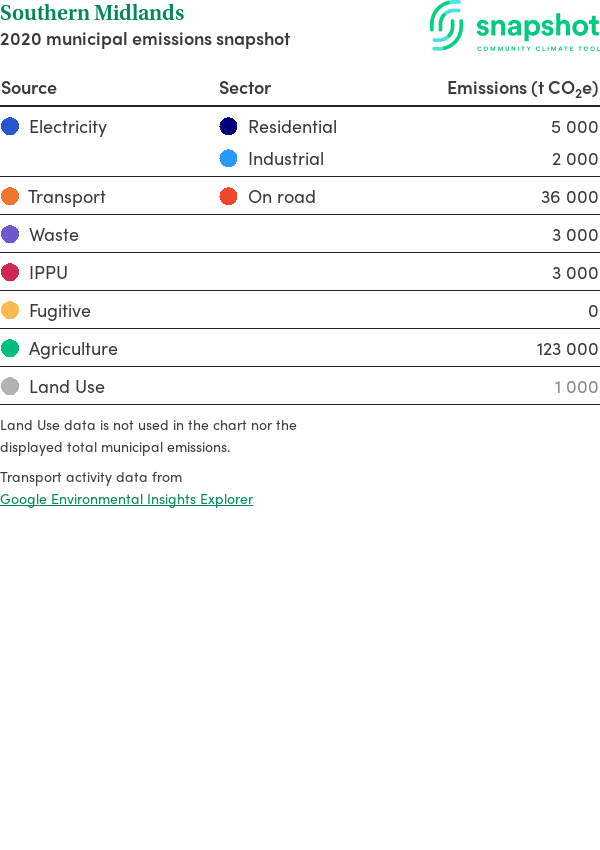 Southern Midlands is a municipality that is moderate in size relative to the state average and has a low urban density. Its major emissions source is agriculture, due to the community’s relatively large amount of agricultural activity and low population. The second largest source of emissions is on road transportation.
