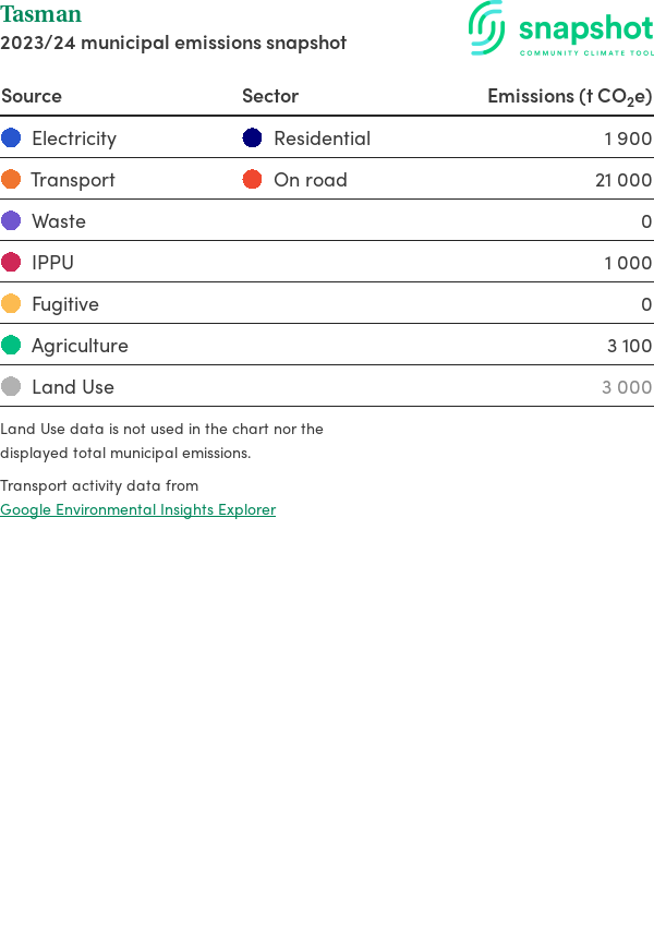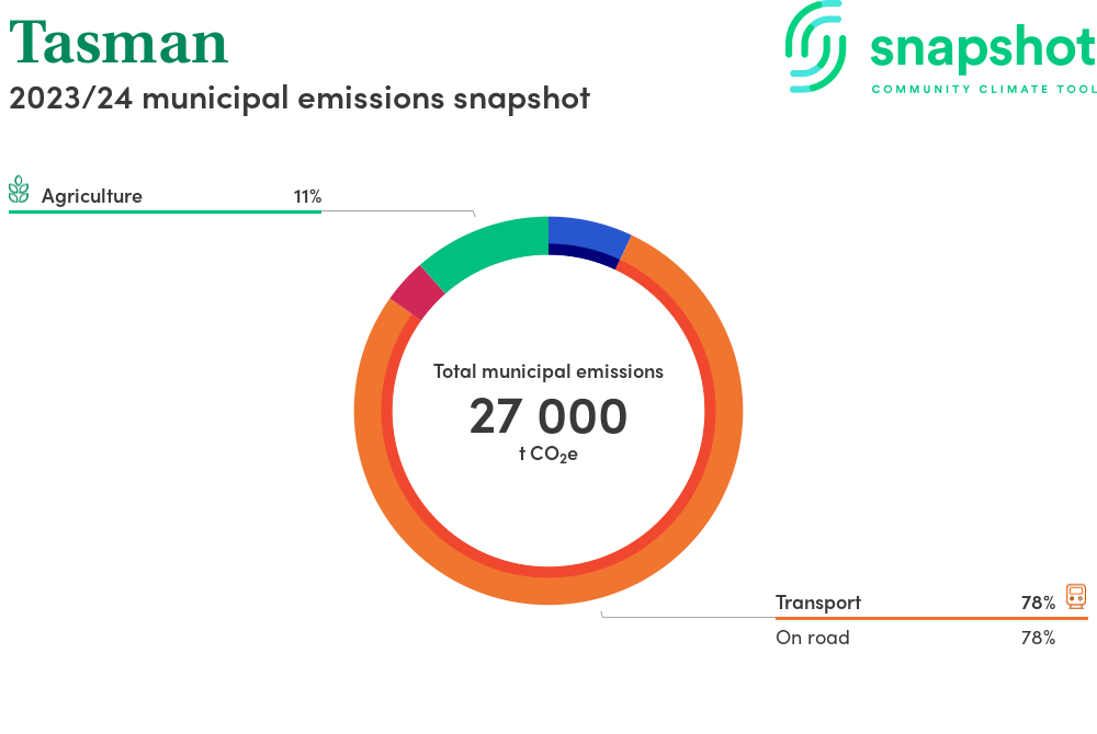 Tasman is a municipality that is geographically small relative to the state average and has a low urban density. Its major emissions source is on road transportation, due to the community’s larger commuting and other travel requirements. The second largest source of emissions is agriculture.