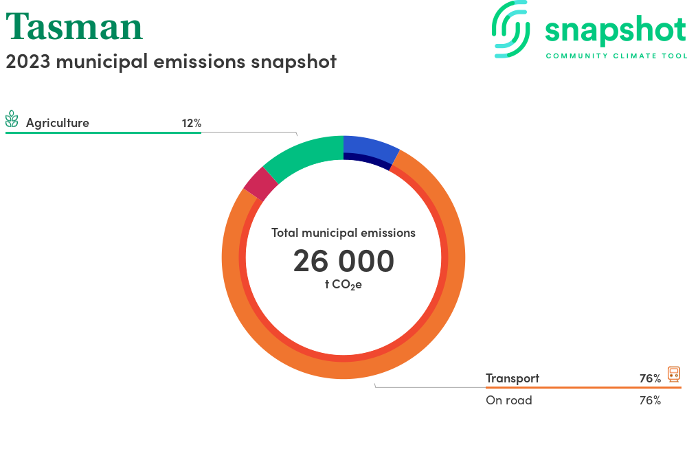 Tasman is a municipality that is geographically small relative to the state average and has a low urban density. Its major emissions source is on road transportation, due to the community’s larger commuting and other travel requirements. The second largest source of emissions is agriculture.