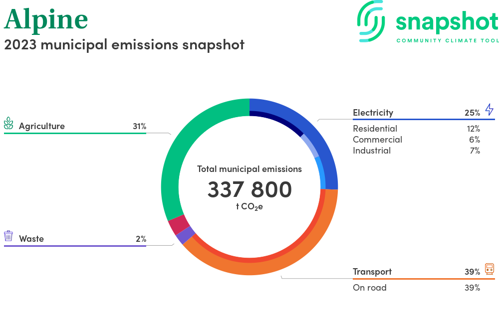 Alpine is a rural municipality that is moderate in size relative to the state average and has a low urban density. Its major emissions source is agriculture, due to the community’s relatively large amount of agricultural activity and low population. The second largest source of emissions is on road transportation.