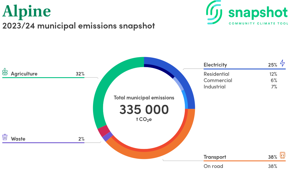 Alpine is a rural municipality that is moderate in size relative to the state average and has a low urban density. Its major emissions source is agriculture, due to the community’s relatively large amount of agricultural activity and low population. The second largest source of emissions is on road transportation.