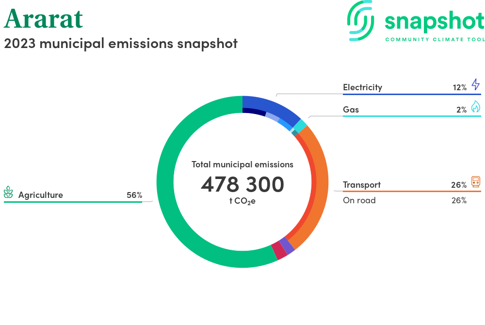 Ararat is a rural city that is moderate in size relative to the state average and has a low urban density. Its major emissions source is agriculture, due to the community’s relatively large amount of agricultural activity and low population. The second largest source of emissions is on road transportation.